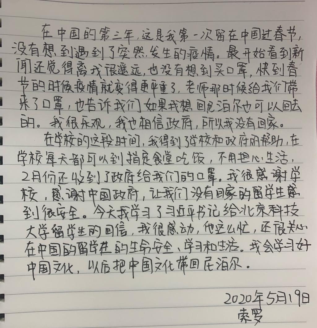 在学校的这段时间,我得到了学校和政府的帮助,在学校每天都可以到指定食堂吃饭,不用担心生活,2月份还收到了政府给我们的口罩。我很感谢学校,感谢中国政府,让我们这些没有回家的留学生感到很安全。今天我学习了习近平总书记给北京科技大学留学生的回信,我很感动,他这么忙,还很关心在中国的留学生的生命安全、学习和生活。我会学好中国文化,以后把中国文化带回尼泊尔。