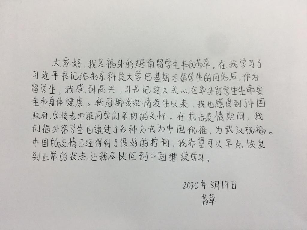 大家好,我是福外的越南留学生韦氏芳草。在我学习了习近平总书记给北京科技大学巴基斯坦留学生的回信后,作为留学生,我感到高兴,习总书记这么关心在华外(国)留学生生命安全和身体健康。新冠肺炎疫情发生以来,我也感受到了中国政府、学校老师跟同学们亲切的关怀。在抗击疫情期间,我们福外留学生也通过了各种方式为中国祝福,为武汉祝福。中国的疫情已经得到了很好的控制,我希望可以早点恢复到正常的状态让我尽快回到中国继续学习。