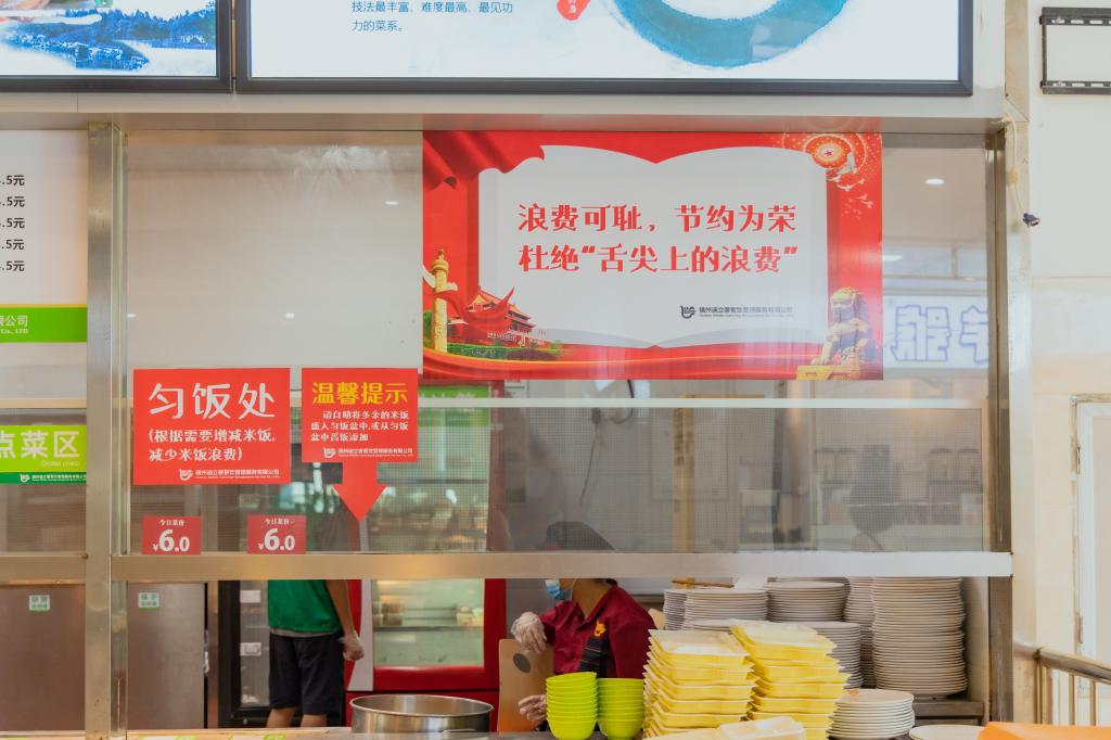 膳食管理委员会的学生,身披绶带,充当起了“节约粮食劝导员”,提醒就餐者珍惜粮食、文明就餐,养成厉行节约的良好习惯。