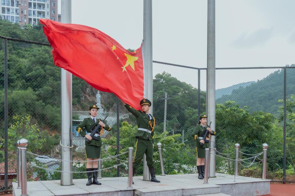 上午7时,校国旗护卫队的同学们昂首挺胸,护卫着五星红旗整齐入场,伴随着雄壮的国歌,鲜艳的五星红旗冉冉升起,师生手持小国旗,深怀对祖国的崇高敬意,面向国旗行注目礼。