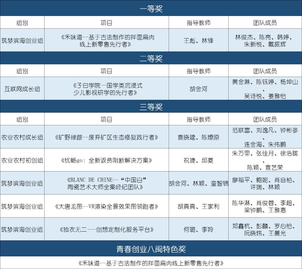 近日,由共青团福建省委、福建省省委网信办、省委台港澳办、省教育厅、省人社厅等单位共同主办的第七届“创青春”福建省青年创新创业大赛暨福建省第二届返乡大学生创新创业大赛落下帷幕。大赛设工商组、互联网组、筑梦滨海创业组、农业农村组、创想大樟溪组5个类别,经过激烈角逐,我校共斩获8个奖项,其中一等奖1项、二等奖1项、三等奖5项,青春创业八闽特色奖1项。
