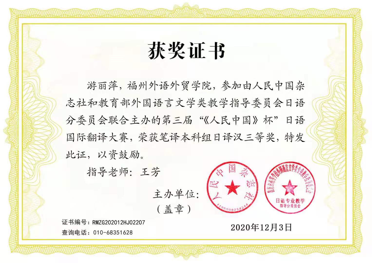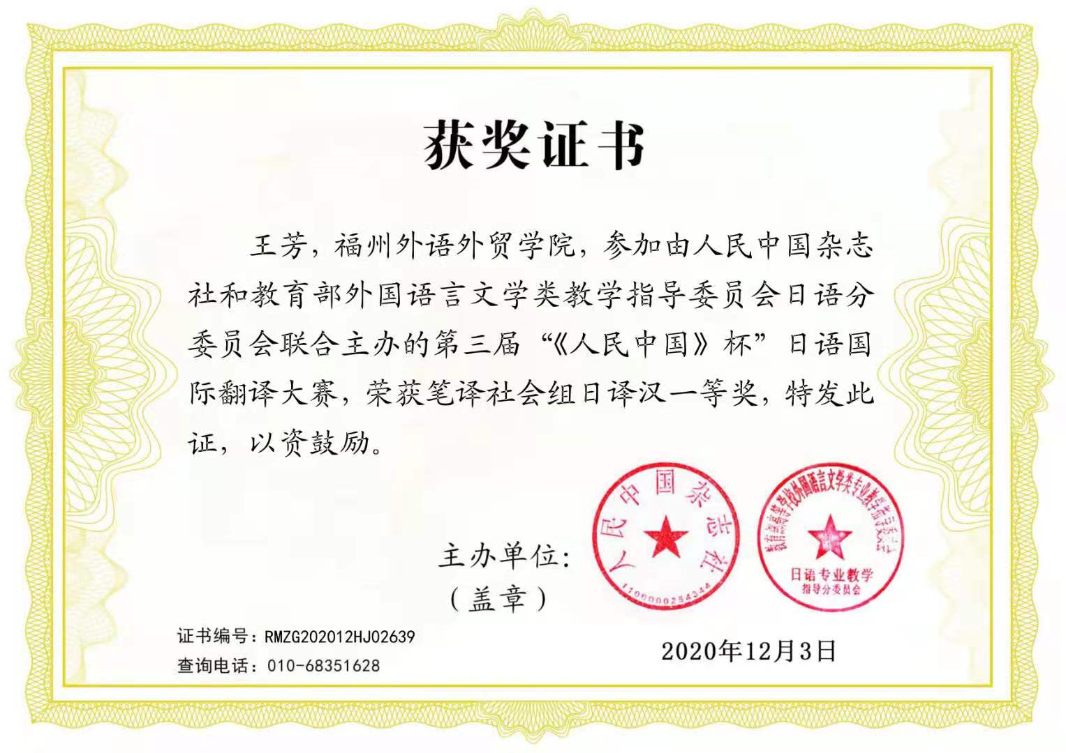 12月3日,2020年第三届“人民中国杯”日语国际翻译大赛获奖名单公布,我校外国语学院教师王芳及其指导的2018级日语专业学生游丽萍荣获佳绩。在笔译社会组日译汉项目中,王芳以总分第一名的成绩荣获一等奖;在笔译本科组日译汉项目中,游丽萍荣获三等奖。同时,王芳作为指导教师还荣获“优秀指导教师奖”。