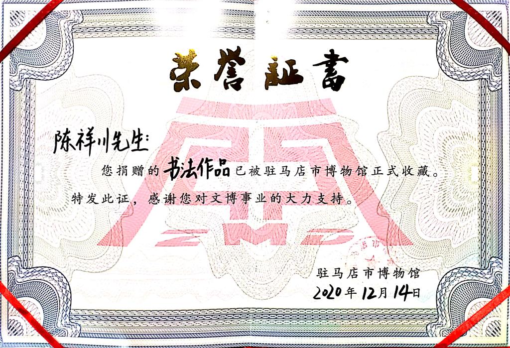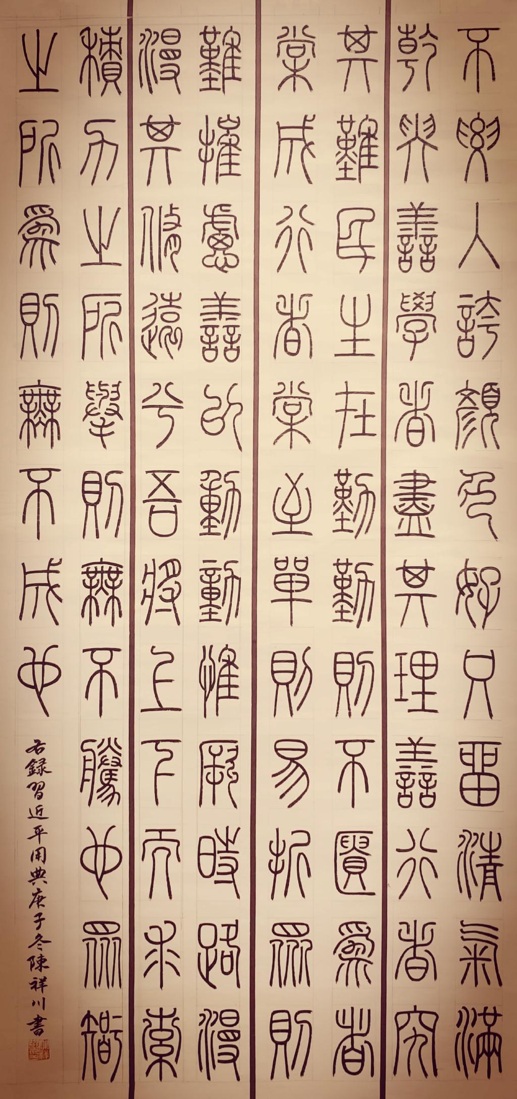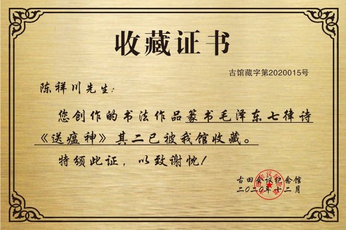 陈祥川在精进自身书法技艺的同时积极传承中华传统文化。经过多年沉淀,其书法作品入选福建省第三届书坛新人新作展、福建省首届瓷板书法刻字艺术联展、首届“钢都杯”全国书法大赛、第四届"逸道雅集"全国硬笔书法大赛等。多幅作品收藏于重庆自然博物馆、古田会议纪念馆、建川博物馆、中国三线建设博物馆等藏馆。