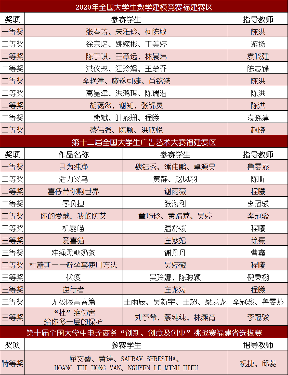 近日,福建省教育厅公布了第十四届福建省大学生学科技能竞赛获奖名单,我校学子在本次大赛中取得优异成绩。共获2020年全国大学生数学建模竞赛福建赛区一等奖1项、二等奖8项,第十二届全国大学生广告艺术大赛福建赛区一等奖1项、二等奖4项、三等奖8项,第十届全国大学生电子商务“创新、创意及创业”挑战赛福建省选拔赛特等奖1项。