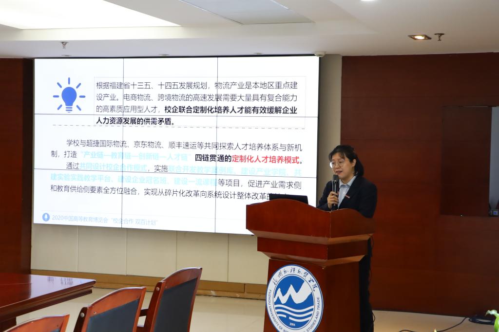 案例负责人、福建致公经济研究院副院长、经管学院副院长刘丹从人才培养模式和机制、主要成效和特色、可推广性等方面作交流汇报,并现场回答了专家的提问。案例合作企业福州京邦达供应链科技有限公司缪辉经理、超捷国际物流集团张王宏总经理分别围绕校企合作模式与机制,创新举措等方面作了汇报。在对案例建设情况的反馈中,专家组对提名案例给予充分肯定,并就进一步推广校企合作成效等提出宝贵建议。许明表示,学校将深刻领会专家组意见,正视问题,全面改进,抓实内涵,以本次走访活动为契机,以高度的责任心、使命感和主人翁精神,用服务学校长远发展的眼光,扎实推进产教融合,努力形成“产教融合、校企合作、知行合一、协同育人”等丰硕成果。