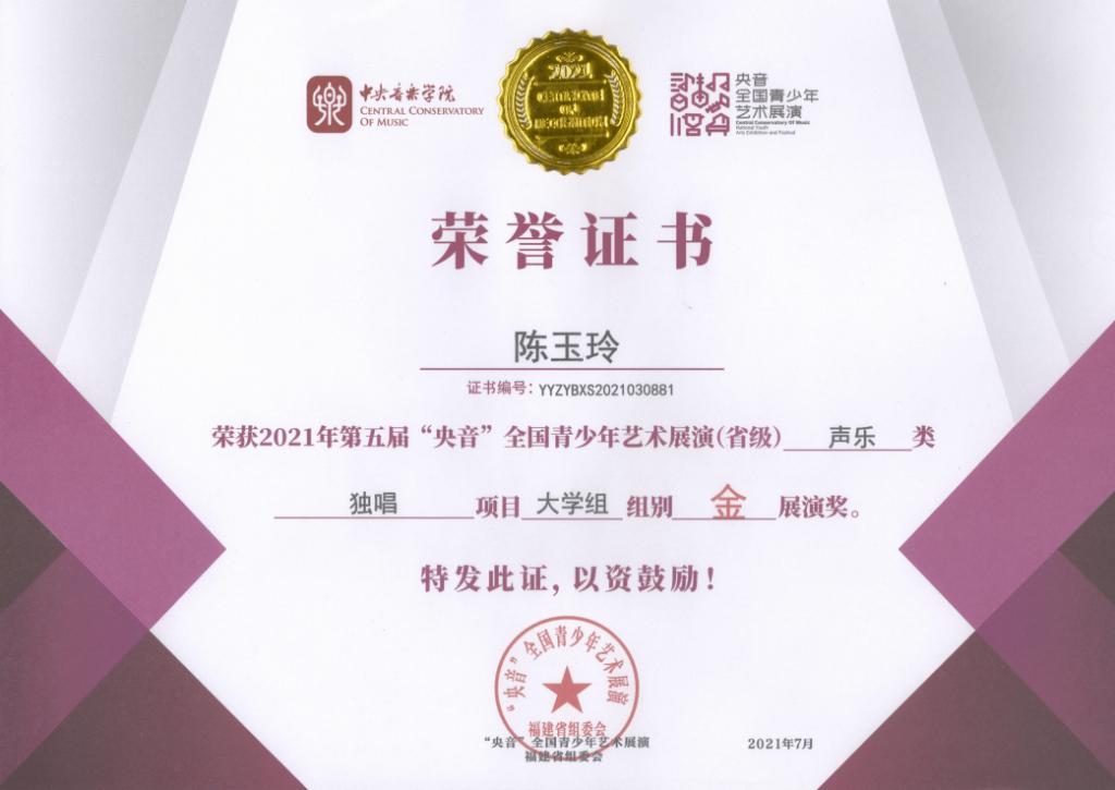6月20日至7月5日,第五届“央音”全国青少年艺术展演福建省级展演在福建厦门举行,大赛吸引省内各大高校学子报名参加。经过层层选拔和激烈角逐,我校教育学院学前教育专业的陈玉玲同学凭借着过硬专业实力及高水平的现场表现,荣获本次活动声乐类独唱项目大学组省级金奖。