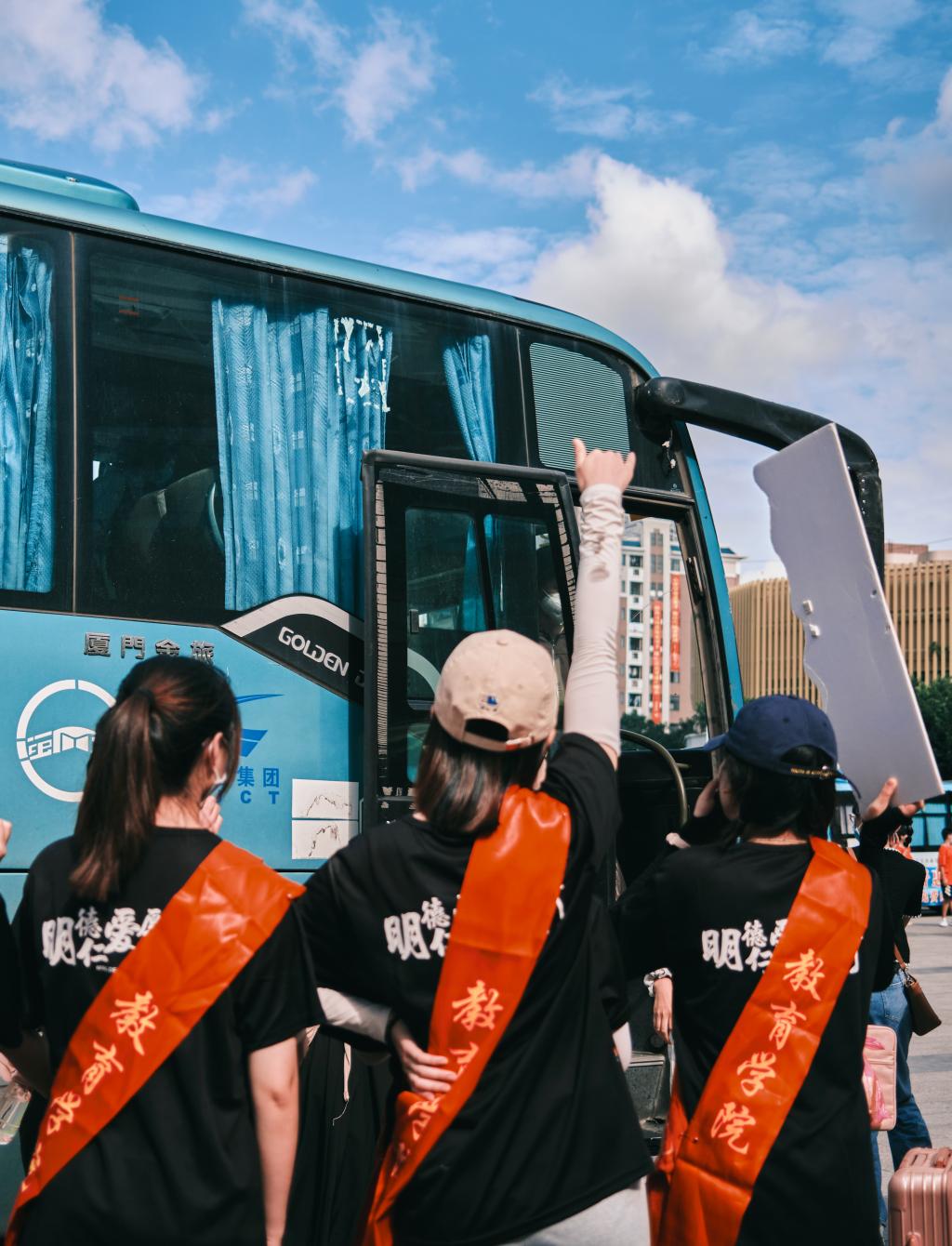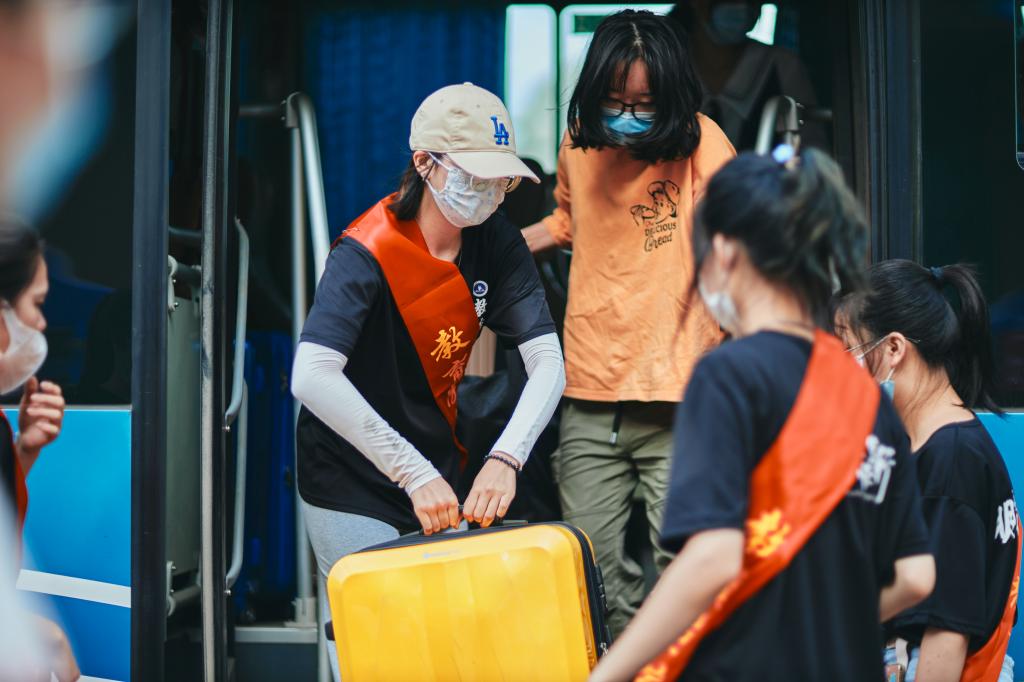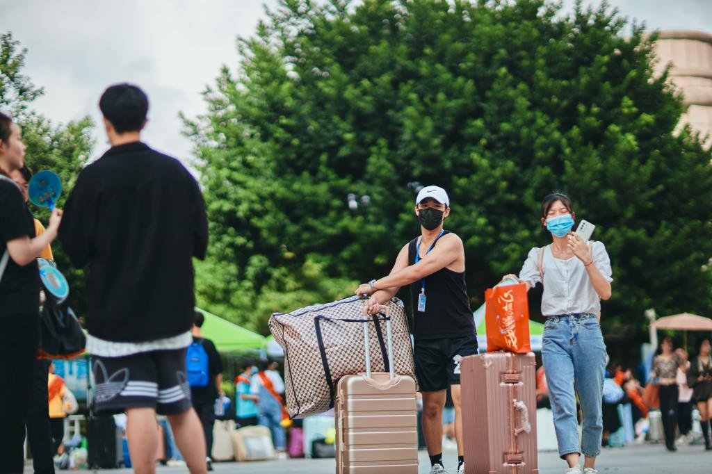 到校的新生陆续搭乘摆渡车前往宿舍区域,此时志愿者们早已等候在宿舍楼下,学长甚至学姐都化身成“大力士”,扛起新生们的行李就上楼。学生党员也活跃在迎新现场,以实际行动践行承诺。