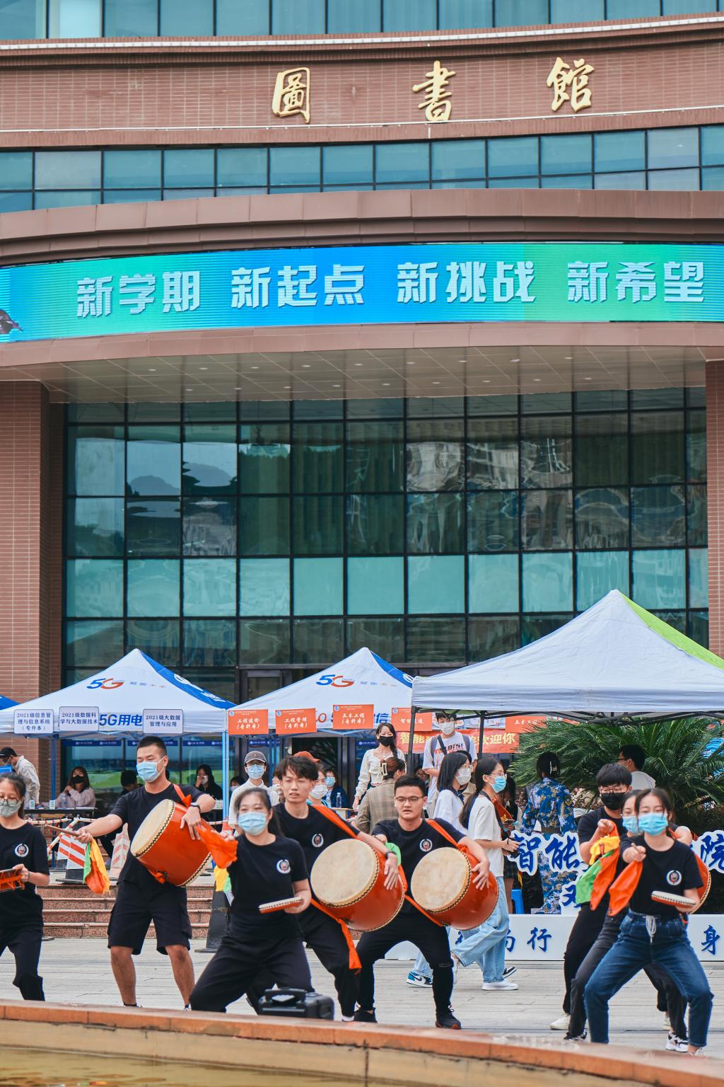 图书馆前的迎新大本营是最热闹的地方,学校的师长都前后奔波,忙碌不停。他们有的高举引导牌、有的帮助新生拿行李、学校太鼓队为欢迎新同学准备了精彩的表演、吉祥物“福小外”也前来助阵......现场热闹非凡。