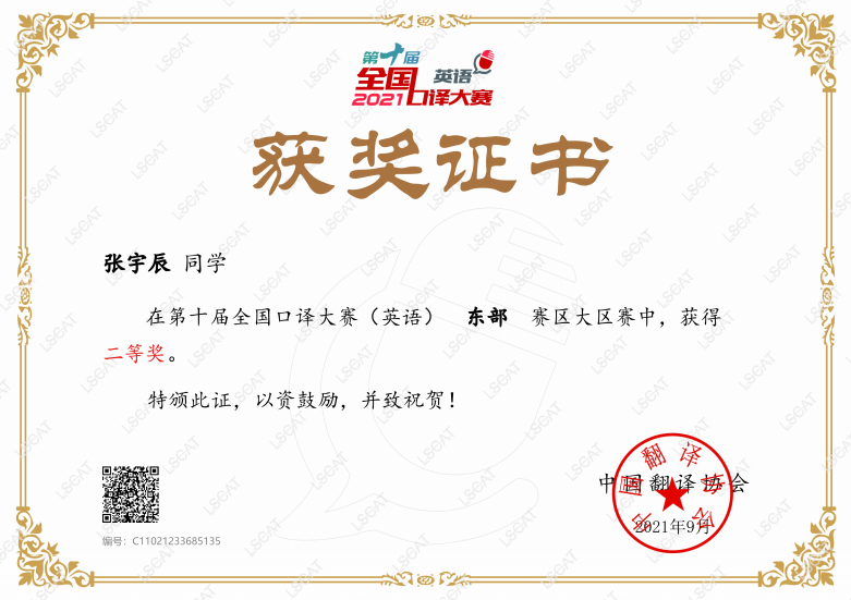 据悉,全国口译大赛由中国外文局指导,中国翻译协会主办,是全国在校大学生口译类最权威赛事,获奖率为7%,大赛旨在促进翻译学科建设和语言服务行业的繁荣与发展、培养高素质语言服务人才,更好的服务国家发展大局和国际传播能力建设。
