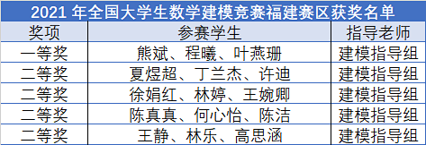 近日,2021 年全国大学生数学建模竞赛福建赛区获奖名单公布,在与来自厦门大学、福州大学等高校参赛者的竞争中,我校学子获一等奖1项、二等奖4项的好成绩。