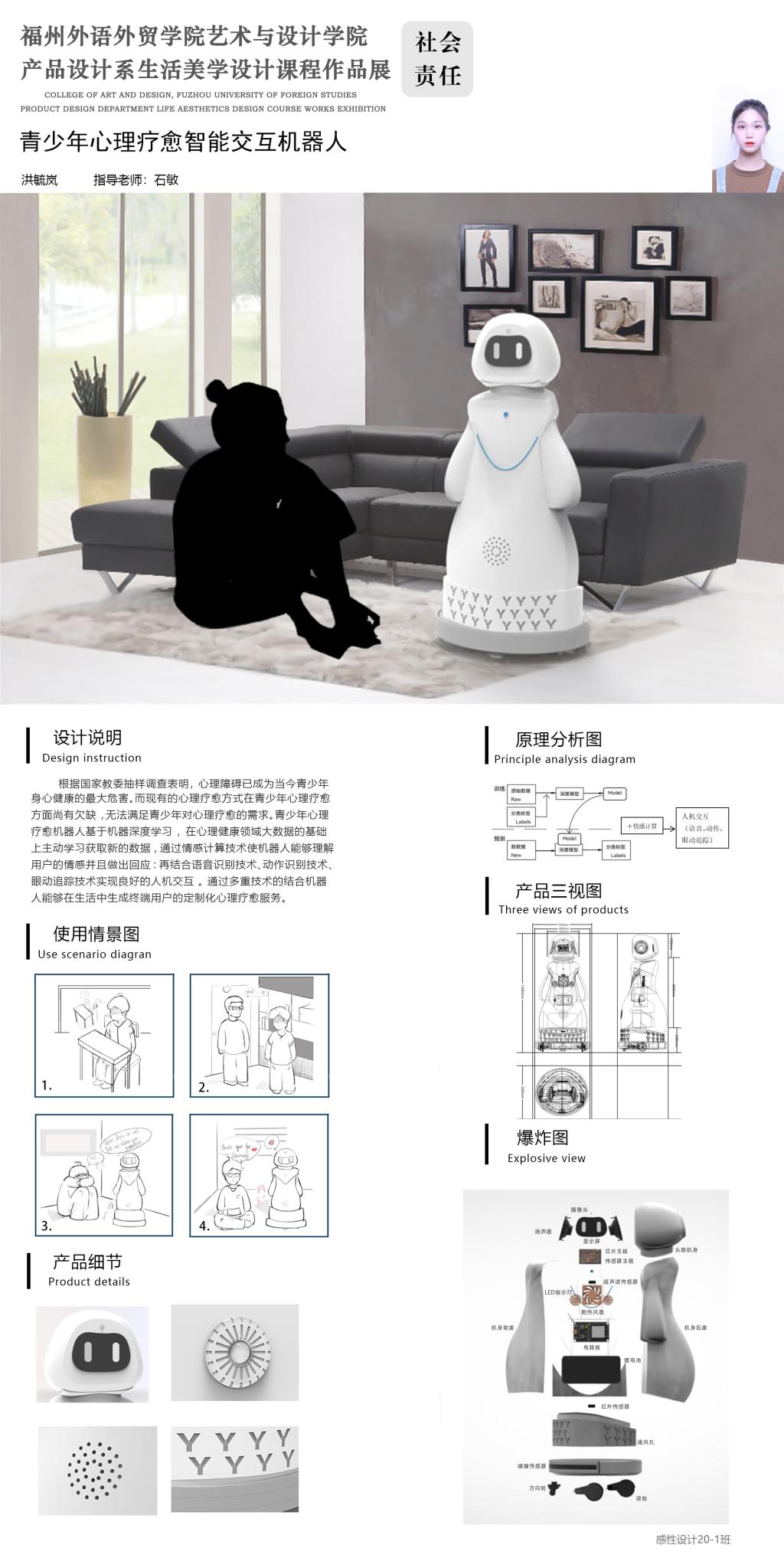 编者按:时下,推动学科交叉融合,增强创新活力,已成为新文科建设的共识。艺术设计与人工智能如何有机融合?人机交互技术如何赋能感性设计?医疗救援机器人、心理疗愈智能交互机器人、融入自然的居住空间规划......福外学子们用自己的设计给出了答案。