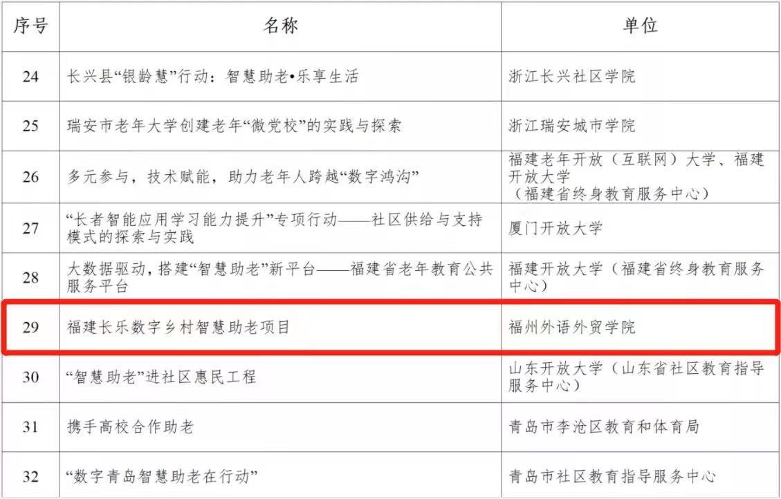 日前,教育部职业教育与成人教育司公布了首批国家级“智慧助老”优质工作案例、优质教育培训项目和优质课程资源名单。我校“福建长乐数字乡村智慧助老项目”成功入选优质工作案例。省内共有4个案例入选,我校是唯一入选的普通高校。相关材料将在全国老年教育资源共享和公共服务平台(www.lnjyw.org)展示推介。