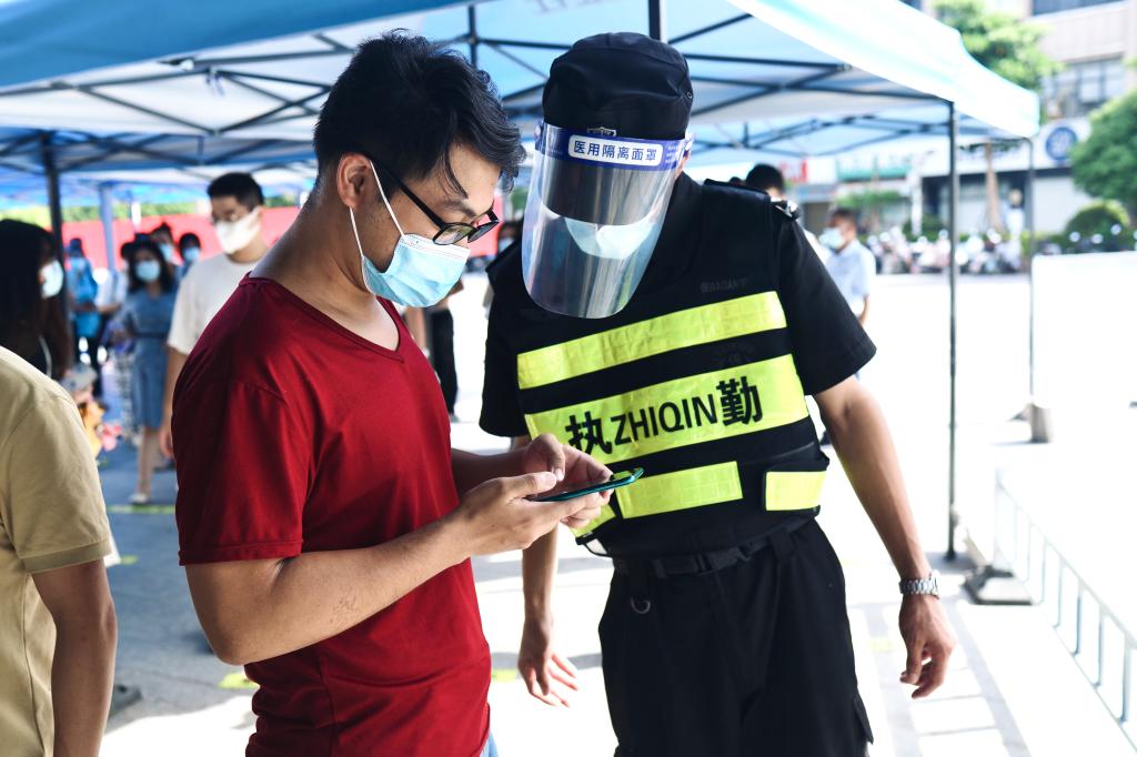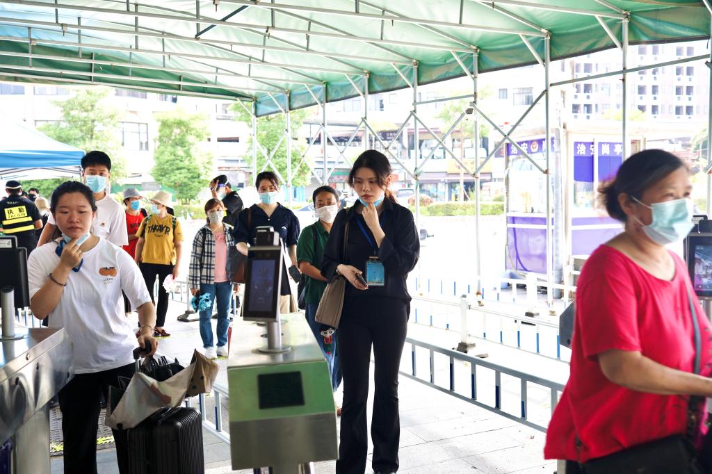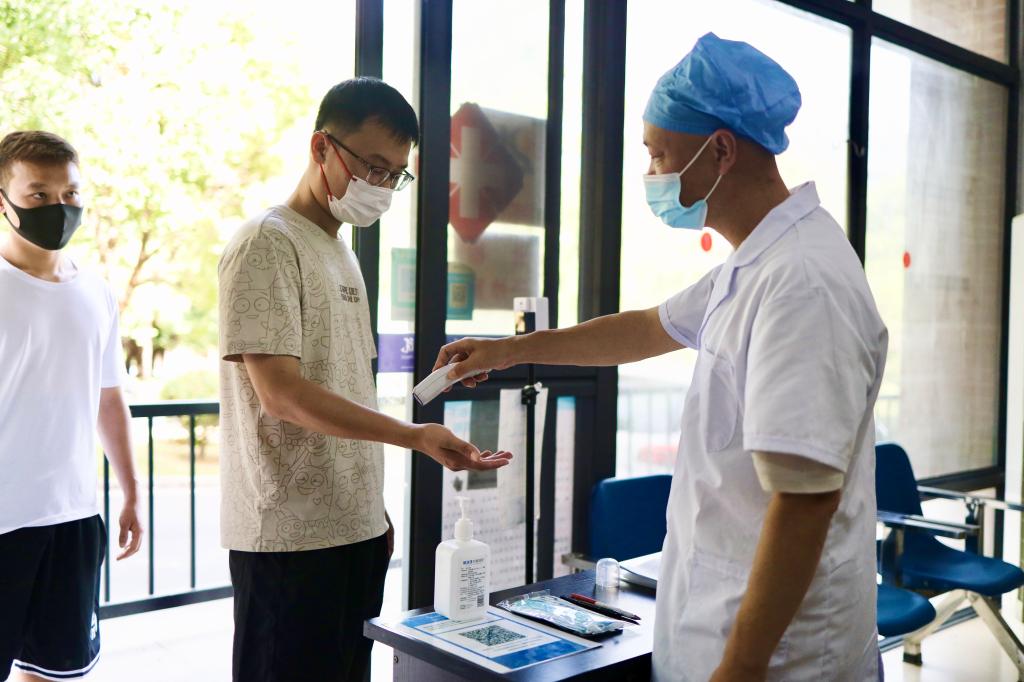 学生入校体温检测异常模拟场景在校门口进行。返校学生在工作人员的引导下有序排队,并保持安全距离,依次完成扫码核验、消毒测温等流程。安保人员逐一核验学生“三码”(健康码、行程卡、48小时内核酸检测阴性报告),学生通过人脸识别通道后方可入校。该场景还重演练了返校人员体温异常情况处置,现场值守工作人员引导体温异常学生进入临时观察点进行体温复测,经水银体温计复测确认该生体温正常。