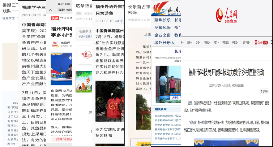 “鱼跃金松”团队的乡村振兴实践得到当地镇、村与企业的大力支持。在与长乐福连金鱼养殖场合作过程中,郑程挺带领团队成员扎根鱼场,深入调研了解企业需求,并通过开发线上小程序推广、开展直播带货等方式,着力提升企业效能,打造长乐区数字化金鱼产业。团队还在福州市科技局的支持下,开展了科技助力数字乡村直播,人民网、中国青年网、中国福建三农网、东南网、长乐新闻等多家权威媒体十余次报道了本次活动。