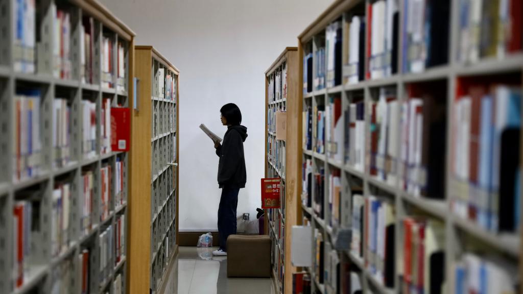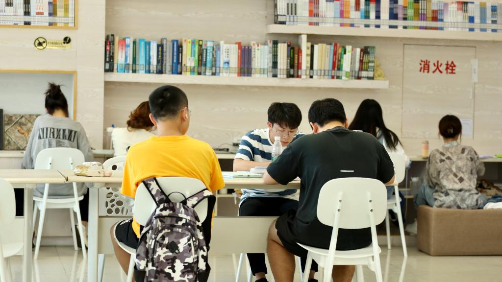 图书馆里、自习室内福外考研学子每天与题海相伴低头是密密麻麻的复习资料