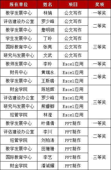 我校首届行政管理人员技能大赛成绩于12日出炉,教学发展中心林娟、教师发展中心李玲、教学发展中心叶倩倩分别获得公文写作、Excel应用以及PPT制作项目一等奖,教学发展中心、评估建设办公室、教师发展中心荣获“优秀组织奖”。