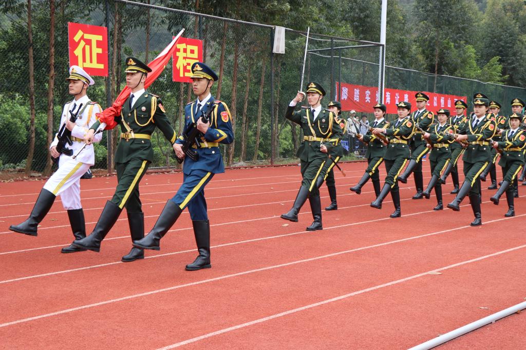 校国旗护卫队迈着铿锵有力的步伐走向国旗台,对于参训的学生来说,国旗护卫队的队列动作就是榜样。在全场数千名师生的注目和洪亮的国歌声中,五星红旗徐徐升起。