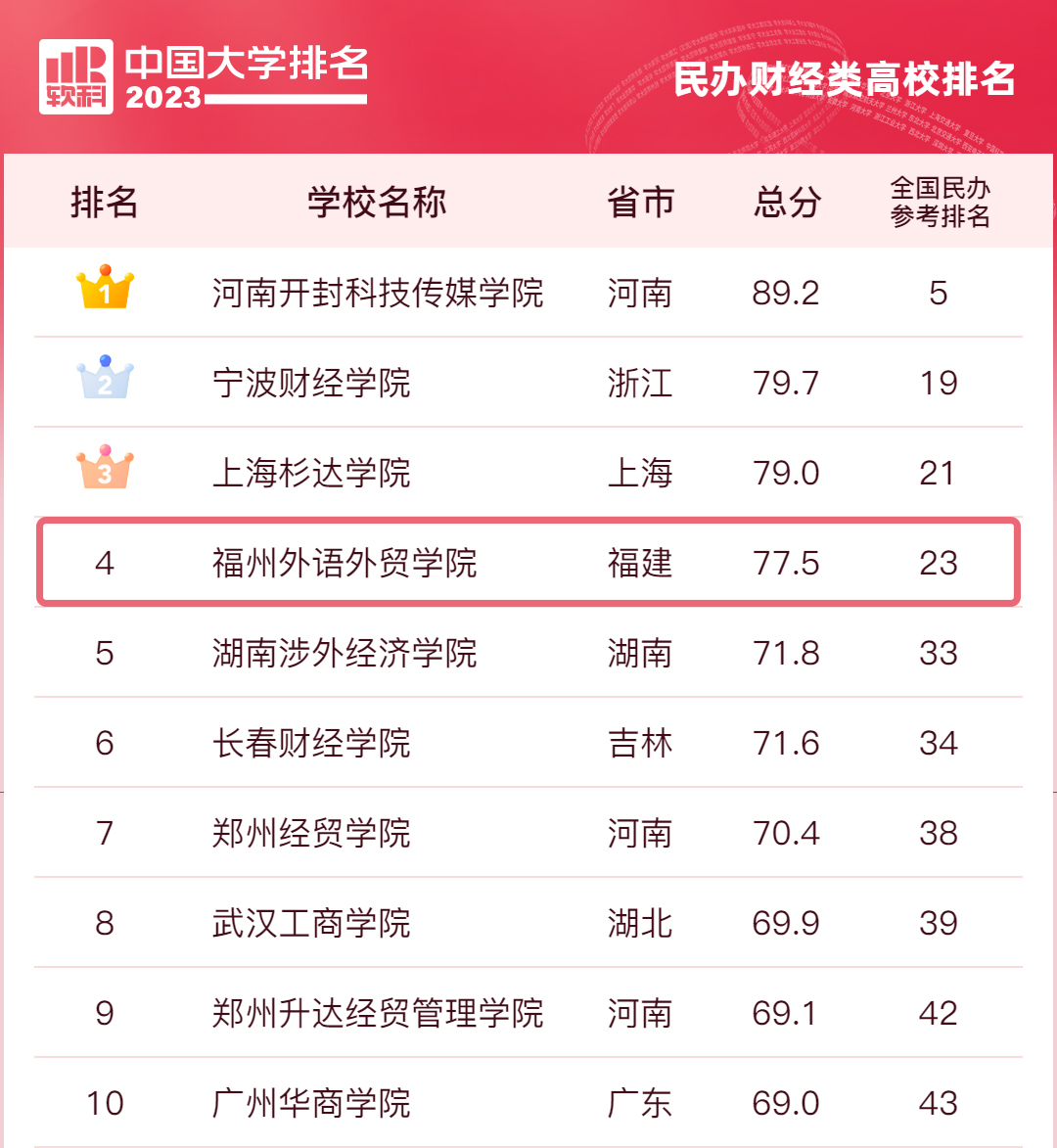3月30日,高等教育专业评价机构软科正式发布“2023软科中国大学排名”,公布了“2023软科中国合作办学大学排名”“2023软科中国民办高校排名”等榜单。我校凭借高质量办学,以77.5分位列“2023软科中国民办高校排名(财经类)”第4位,总榜第23位,稳居福建省第1位。