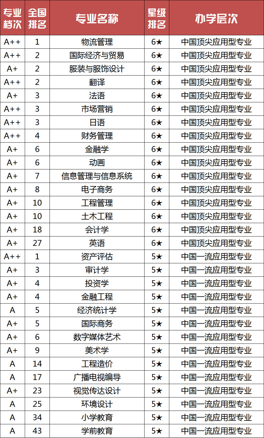 我校物流管理、国际经济与贸易、服装与服饰设计、翻译、法语、市场营销、日语、财务管理、金融学、动画、信息管理与信息系统、电子商务、工程管理、土木工程、会计学、英语等16个专业入选中国顶尖应用型专业,资产评估、审计学、投资学、金融工程、经济统计学、国际商务、数字媒体艺术、美术学、工程造价、广播电视编导、视觉传达设计、环境设计、小学教育、学前教育等14个专业入选中国一流应用型专业。物流管理、资产评估、智能建造3个专业在中国大学专业排名(应用型)中均位列第一。