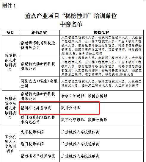 日前,福建省人力资源和社会保障厅发布《福建省人力资源和社会保障厅办公室关于公布重点产业项目和重点群体项目“揭榜挂帅”职业技能培训中榜名单的通知》(闽人社办〔2023〕100号),我校中榜重点产业项目“揭榜挂帅”培训单位,中榜项目(工种)为“数据分析与应用人才培训项目(数据分析师)”。