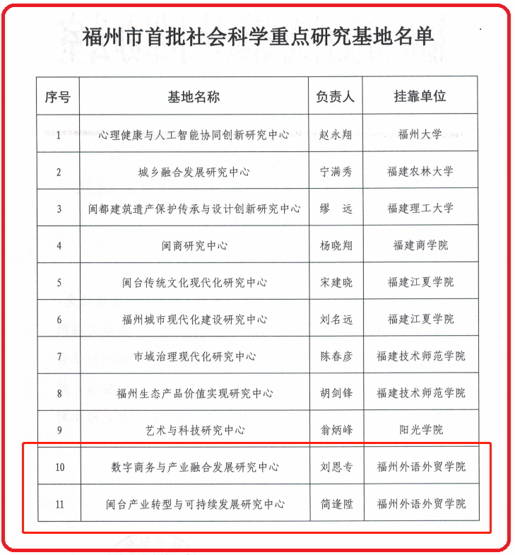 日前,福州市社科规划领导小组办公室公布了福州市首批社会科学重点研究基地的名单(榕社科规划办〔2023〕5号),依托我校国际商学院、金融学院申报建设的“数字商务与产业融合发展研究中心” “闽台产业转型与可持续发展研究中心”获批福州市社会科学重点研究基地。据了解,首批确立的福州市社会科学重点研究基地共包含11个研究平台。