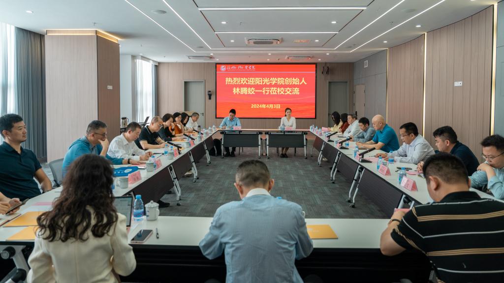 4月3日,阳光学院创始人林腾蛟、董事长何玫、校长乔海曙一行来校考察交流。我校校领导许明、黄建平、季祖强、钟杭州、黄鸿鸿热情接待了来宾,并展开友好座谈。