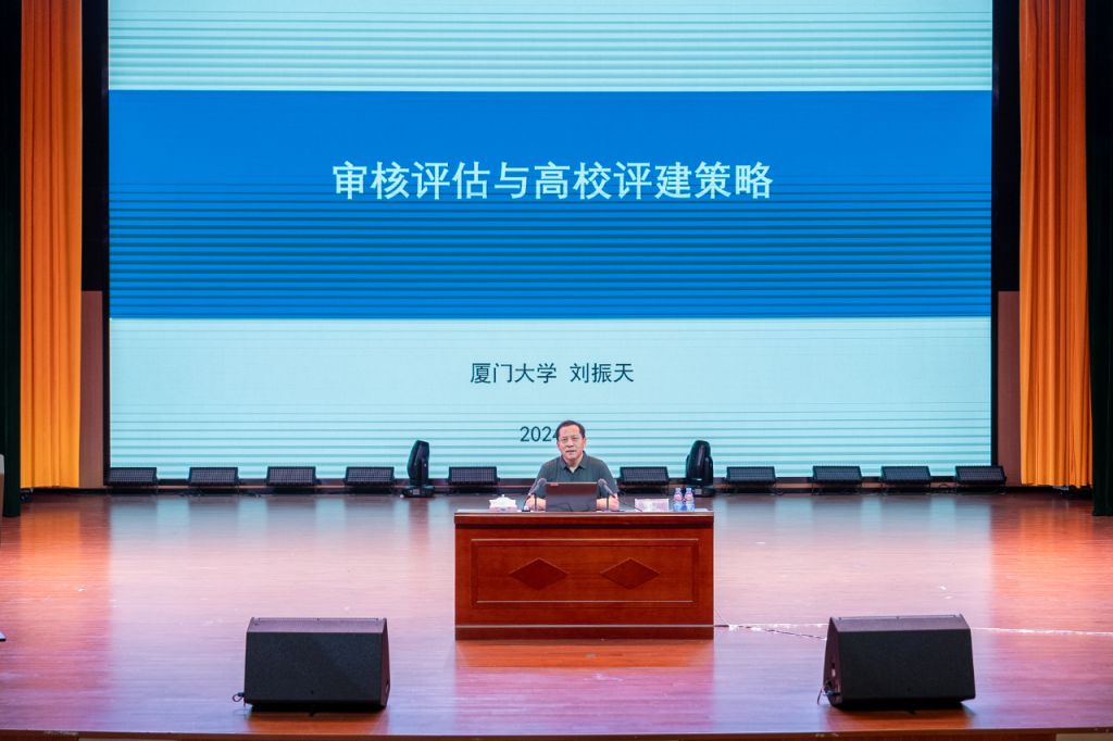 会上,厦门大学教育研究院党委书记、博士生导师刘振天教授以《把握审核评估精髓 促学校高质量发展》为题作专题辅导。刘教授结合多年参加教育部教育教学评估的经验和自身工作实践,从评估的意义及发展历程、审核评估对象和功能定位、审核评估指标体系核心要义及考察重点等方面进行详细、深入地阐释。报告内容丰富、思想深刻、深入浅出,涵盖宏观政策解读和具体实践路径的微观辅导,为我校全面落实立德树人根本任务,准确把握审核评估工作重点,吃透审核评估指标内涵,做好自评自建工作指明了方向。