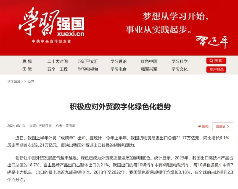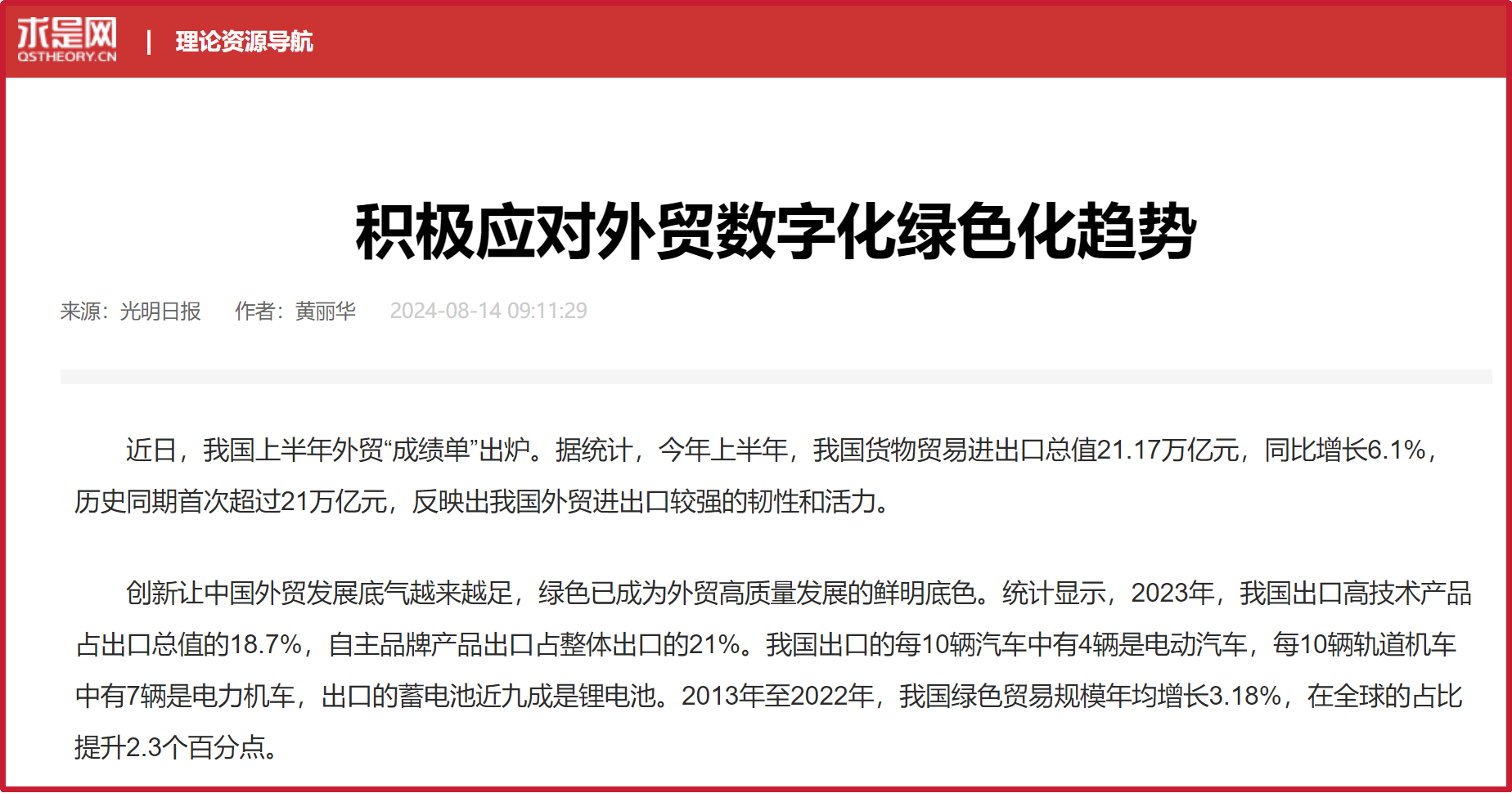近日,《光明日报》刊登了我校黄丽华教授、福建省习近平新时代中国特色社会主义思想研究中心特约研究员的“积极应对外贸数字化绿色化趋势” 理论文章。文章根据《中共中央关于进一步全面深化改革、推进中国式现代化的决定》就深化外贸体制改革作出重要部署和精神,在全面分析我国上半年外贸“成绩单”的基础上,提出:数字化、绿色化是国际贸易发展的方向和未来,也是外贸产品创新、结构升级的两大新动能;外贸数字化与绿色化转型,不仅助力塑造外贸新格局,还有利于赢得更多发展主动权、扩大市场影响力;进一步完善顶层设计、夯实绿色基建、加强跨界合作,从而推进产业转型、模式创新,将为外贸高质量发展注入更多新动能。