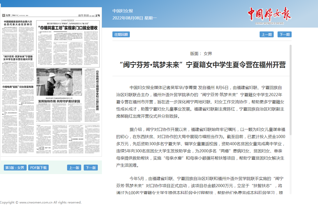 中国妇女报报道:“闽宁芬芳·筑梦未来”宁夏籍女中学生夏令营在福州开营